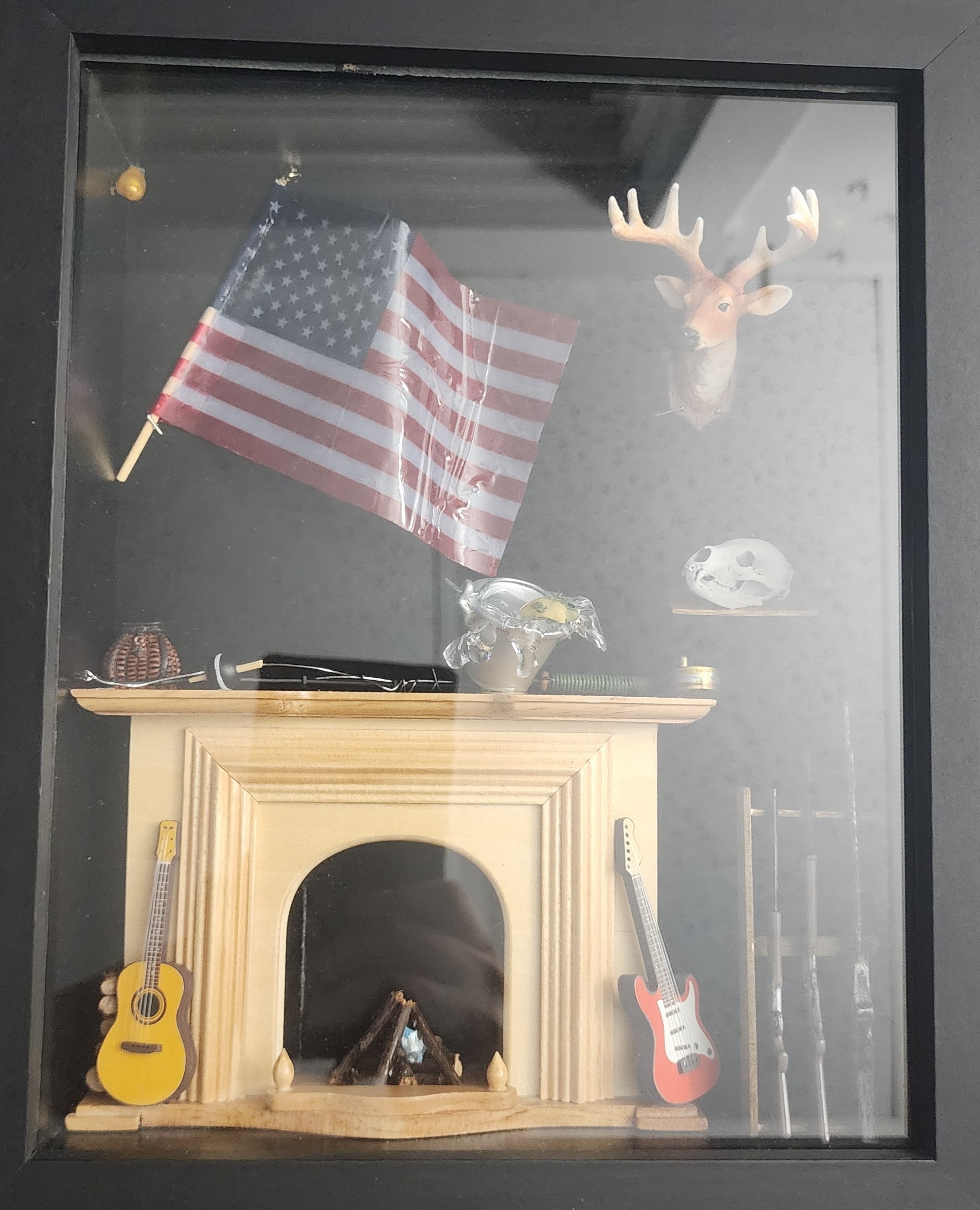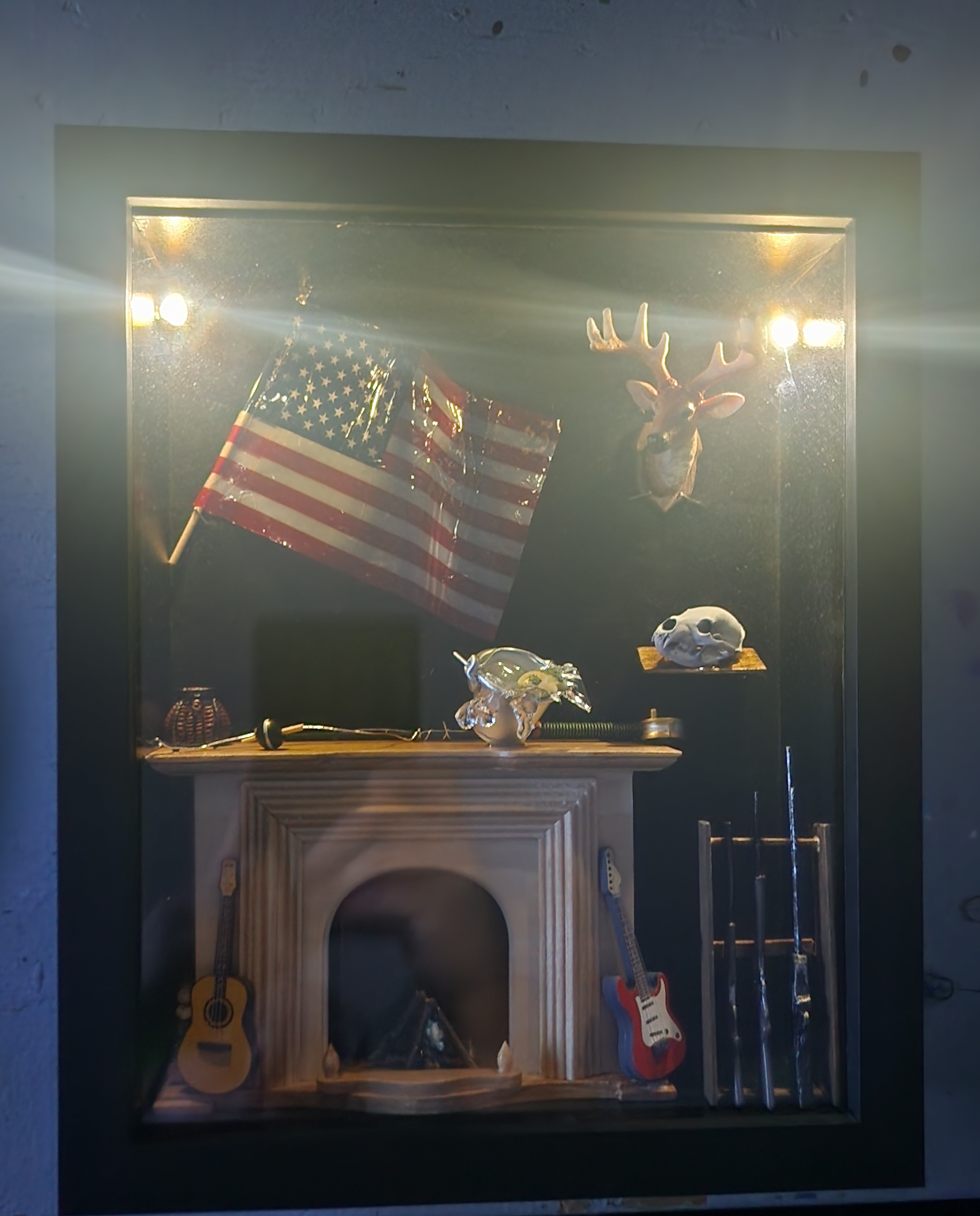 Wishing to commemorate their passions and previous victories on the battlefield of the forest, this commissioner asked for several specifics to be included in the piece. I made a point to include a black bear skull from a previous hunt, and no hunter’s lounge would be complete without a handmade gun rack. I also made sure to include some hearthside entertainment since he is a very large music lover.