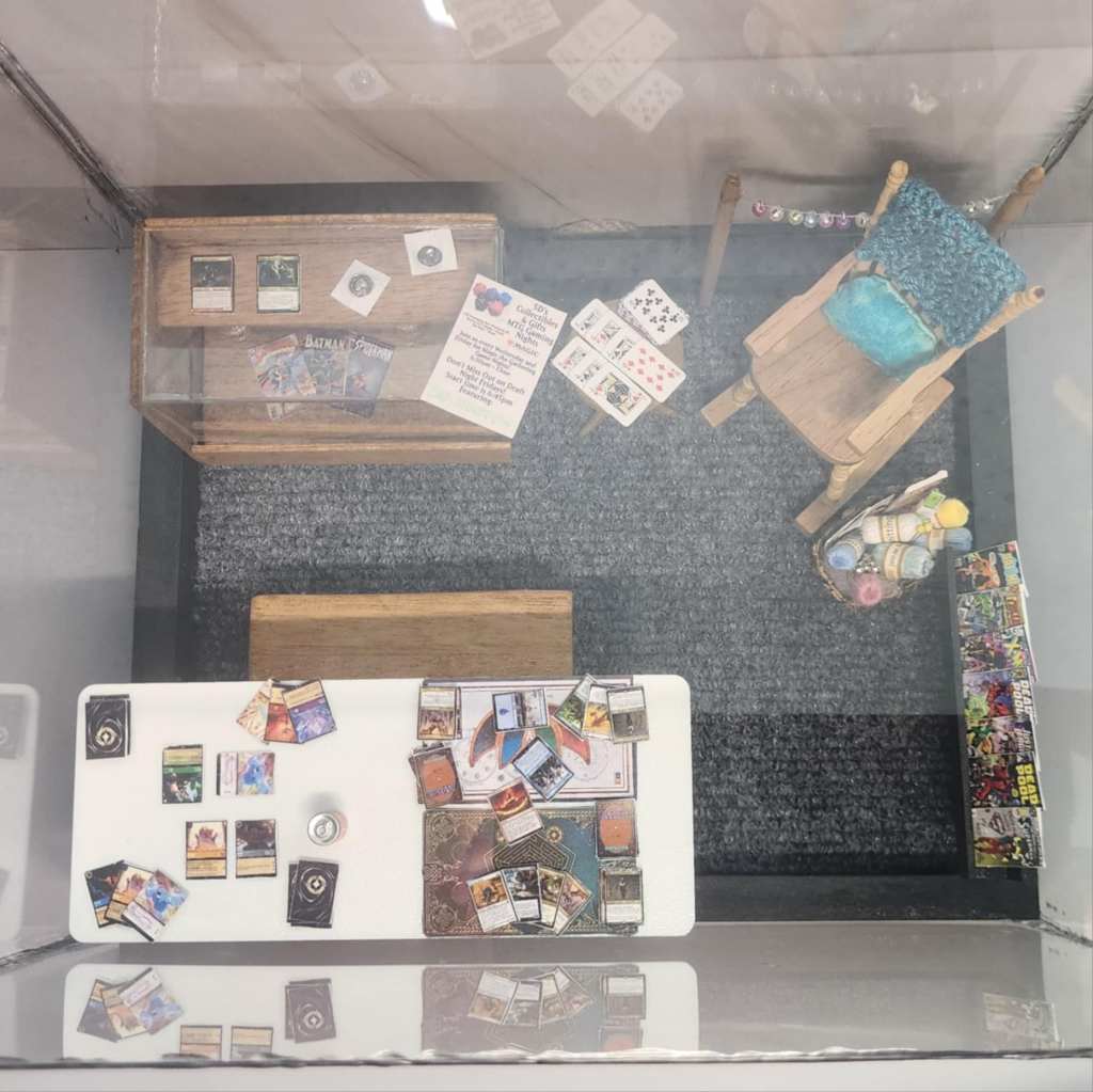 Distilling the love and joy that permeates this shop was an extreme pleasure. From creating miniature Lorcana and Magic the Gathering cards, to learning how to crochet on such a small scale, to making a display case for the collectible coins and Beanie Baby, this piece taught me so many skills. I made sure to include as many details as possible to make sure that your eyes stay busy when enjoying this work of art.